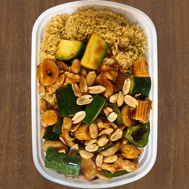 Zucchini, water chestnuts, green pepper, peanuts in spicy brown sauce. With steam rice.