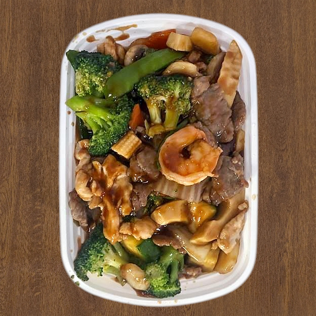 Chicken, beef, shrimp, with mixed veggies in brown sauce.