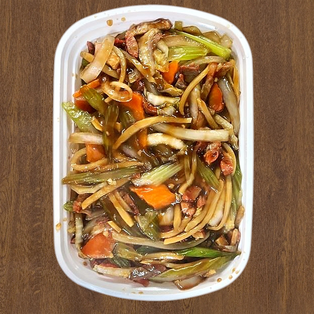 Celery, water chestnut, bamboo, green pepper in garlic sauce. With steam rice.